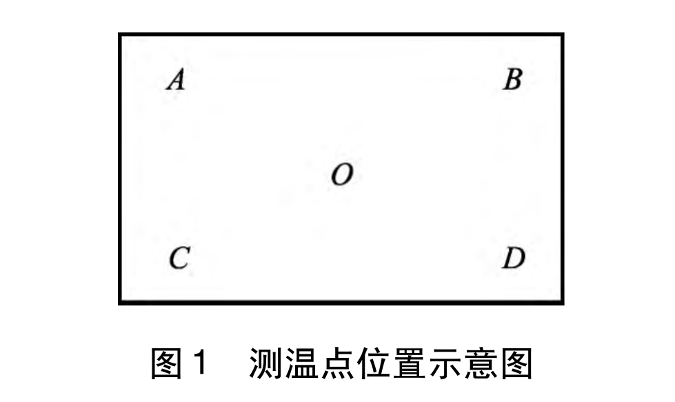 將恒溫水浴加熱到被測(cè)溫度點(diǎn) 40 ℃。選取 5個(gè)測(cè)溫點(diǎn): 水浴鍋工作區(qū)幾何中心 O 點(diǎn),4 個(gè)角的測(cè)溫點(diǎn) ( A,B,C,D) 到
