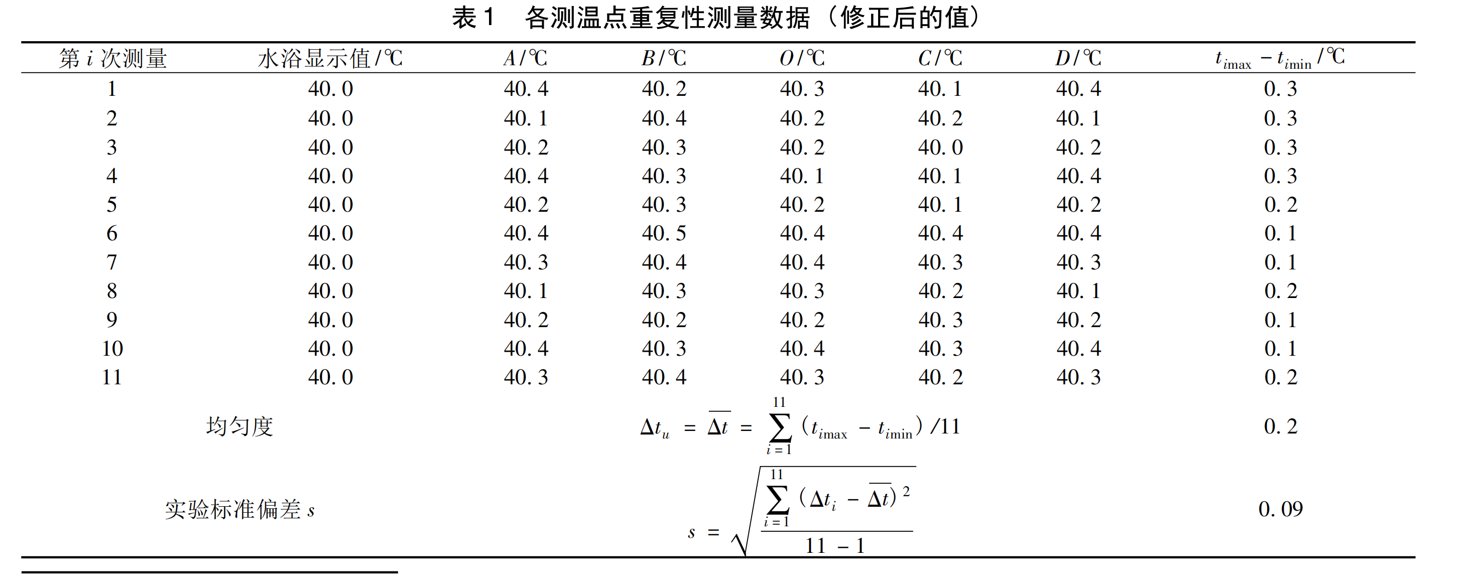 每隔 3 min 測(cè)量一次,共計(jì) 11 次,記錄各測(cè)溫點(diǎn)和水浴顯示的溫度值。每次測(cè)試中最高溫度與最低溫度差值的算術(shù)平均值即