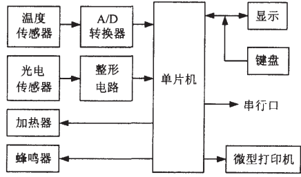 根據上述四個方面的要求,采用單片機作為核心器件組成瀝青軟化點自動檢測裝置,這樣可以使瀝青軟化點的自動檢測達到智能化。下面介紹一下軟化點自動檢測裝置的總體設計。圖1是軟化點檢測系統組成原理框圖。從圖1可以看出,瀝青軟化點檢測系統是由單片機+溫度傳感器+光電傳感器,顯示部分,鍵盤,微型打印機和串行口等組成。單片機是檢測系統的核心,負責數據的采集,處理和整個系統的協調工作;溫度傳感器把燒杯中的水或甘油溫度傳送到A/D轉換器,轉換后送到單片機進行數據處理;光電傳感器把被檢測的瀝青試樣受熱后下墜達到25.4mm的信息通過整形電路送入單片機,以便確定瀝青軟化點;顯示部分把系統運行和操作過程中的信息顯示給操作人員,使其能及時了解軟化點檢測裝置的運行情況;鍵盤是人機對話的必要工具,用它可以在軟化點檢測裝置運行前輸入必要的信息;微型打印機用來輸出軟化點檢測結果等相關數據;蜂鳴器用于報警;串行口是為單片機與pc機交換數據而預留的。